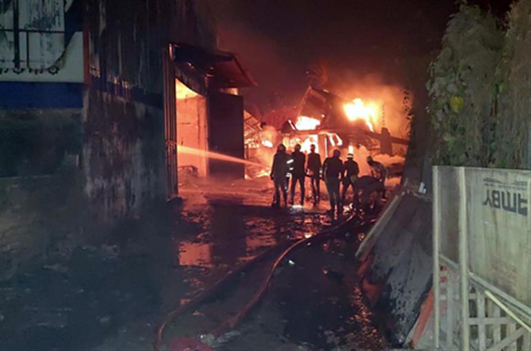 The fire department received reports of the fire in the wee hours of Monday, however, due to the warehouse being located inside a narrow alley, firefighters faced difficulties in extinguishing the flames as water could not be supplied without long pipes, which delayed bringing the situation under control.