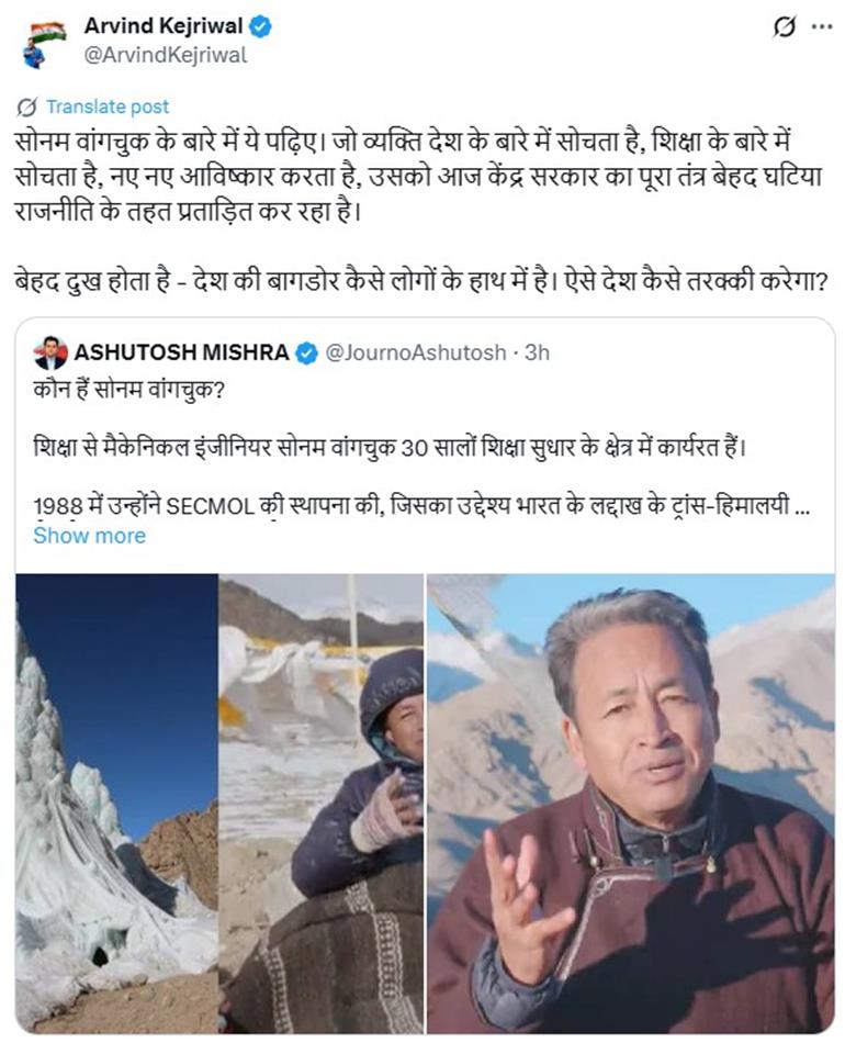 In a post on social media X, Kejriwal wrote, "Read about Sonam Wangchuk. The person who thinks about the country, thinks about education, makes new inventions, is being harassed by the entire machinery of the central government today under extremely cheap politics. It feels extremely sad - how the reins of the country are in the hands of such people. How will such a country progress?" the post read.