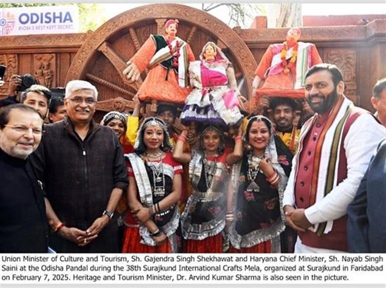 ਚੰਡੀਗੜ੍ਹ, 7 ਫਰਰਵੀ || TC - ਫਰੀਦਾਬਾਦ ਵਿਚ ਪ੍ਰਬੰਧਿਤ 38ਵੇਂ ਸੂਰਜਕੁੰਡ ਕ੍ਰਾਫਟ ਮੇਲੇ ਵਿਚ ਕੇਂਦਰੀ ਸਭਿਆਚਾਰ ਅਤੇ ਸੈਰ-ਸਪਾਟਾ ਮੰਤਰੀ ਸ੍ਰੀ ਗਜੇਂਦਰ ਸਿੰਘ ਸ਼ੇਖਾਵਤ ਅਤੇ ਹਰਿਆਣਾ ਦੇ ਮੁੱਖ ਮੰਤਰੀ ਸ੍ਰੀ ਨਾਇਬ ਸਿੰਘ ਸੈਣੀ ਨੇ ਸ਼ਿਰਕਤ ਕੀਤੀ। ਇਸ ਦੌਰਾਨ ਹਰਿਆਣਾ ਦੇ ਸੈਰ-ਸਪਾਟਾ ਮੰਤਰੀ ਡਾ. ਅਰਵਿੰਦ ਸ਼ਰਮਾ ਵੀ ਮੌਜੂਦ ਰਹੇ। ਮੁੱਖ ਮਹਿਮਾਨ ਤੇ ਹੋਰ ਵਿਸ਼ੇਸ਼ ਮਹਿਮਾਨਾਂ ਨੇ ਮੇਲੇ ਵਿਚ ਵਿਧੀਵਤ ਰੂਪ ਨਾਲ ਰੀਬਨ ਕੱਟ ਕੇ ਉਦਘਾਟਨ ਕੀਤਾ। ਇਸ ਦੇ ਬਾਅਦ ਉਨ੍ਹਾਂ ਨੇ ਇੱਕ-ਇੱਕ ਕਰ ਕੇ ਮੇਲੇ ਦੇ ਸਟਾਲ ਦਾ ਅਵਲੋਕਨ ਕੀਤਾ।